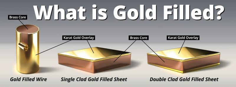 - Gold Filled (Vàng bọc): Nguyên tắc 1/20 tức 5% khối lượng sản phẩm là vàng được bọc bên ngoài, bên trong là lõi hợp kim (Lõi Brass gồm đồng, kẽm, nhôm…)